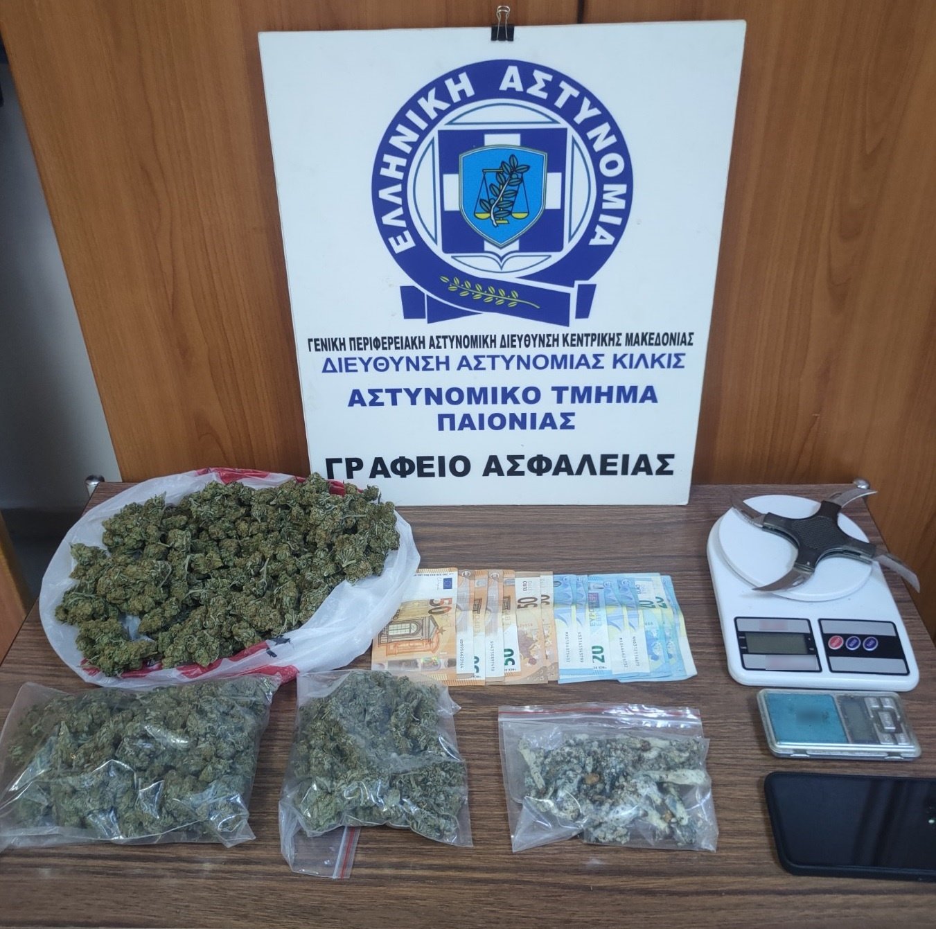 Σύμφωνα με την ΕΛ.ΑΣ., σε έρευνα που ακολούθησε στην κατοικία του, βρέθηκαν και κατασχέθηκαν 624 γραμμάρια ακατέργαστης κάνναβης, 47 γραμμάρια παραισθησιογόνων μανιταριών, δύο ηλεκτρονικές ζυγαριές ακριβείας, ένα πολεμικό μαχαίρι με τέσσερις λεπίδες και το χρηματικό ποσό των 510 ευρώ.