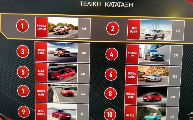 Τα 10 αυτοκίνητα που διεκδίκησαν τον επίζηλο τίτλο και τα οποία έφθασαν στην τελική φάση, από τα 22 συνολικά καινούργια μοντέλα που πρωτοκυκλοφόρησαν τους τελευταίους 12 μήνες στη χώρα μας, βαθμολογήθηκαν με αλφαβητική σειρά, ως εξής: Ford Puma 315, Hyundai i20 274, Nissan Juke 235, Opel Corsa 221, Peugeot 2008 281, Renault Captur 405, Seat Leon 259, Skoda Kamiq 252, Toyota Yaris 242, VW ID 3 216.